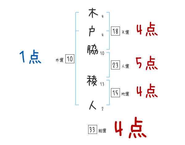 天運![]() | 木戸脇稜人さんの天運は18画の4つ星!情熱的で剛気。忍耐力があり信頼される。 家系が持つ宿命的な運勢を表します。祖先から受け継いだ苗字ですので自分の力が及びません。家柄を象徴します。 |