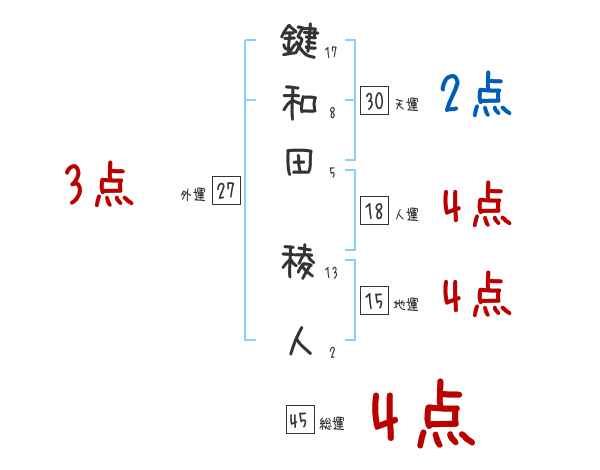 総運![]() | 鍵和田稜人さんの総運は45画の4つ星!もくもくと物事を進め達成する。地味な努力家。 あなたの人生を表す1番重要な運勢です。生涯を通じて影響する総合運となり、主に50歳以降の晩年期に影響を及ぼします。 |