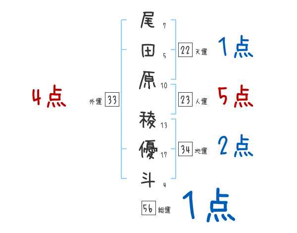 外運![]() | 尾田原稜優斗さんの外運は33画の4つ星!権力志向でプライドが高い。勇気があり運を切り開き成功する。 生活面を象徴する運勢です。外部から受ける影響力を表し、結婚運、家庭運や職場、環境への順応性を表します。 |