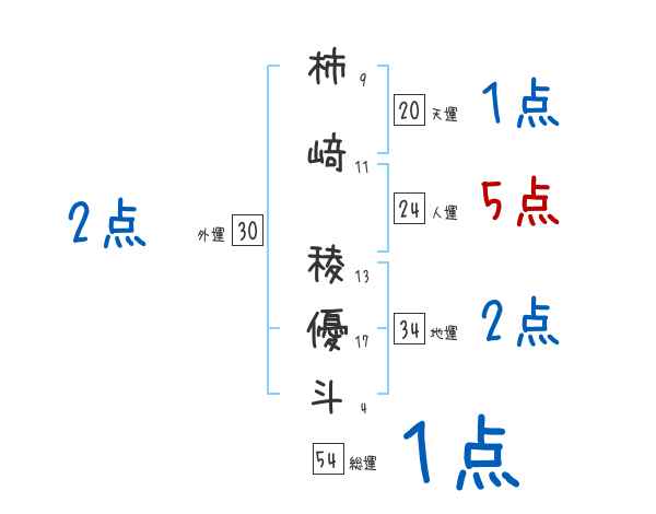 総運![]() | 柿﨑稜優斗さんの総運は54画の1つ星!トラブルが多いかも。周りをよく見て協調して過ごしましょう。 あなたの人生を表す1番重要な運勢です。生涯を通じて影響する総合運となり、主に50歳以降の晩年期に影響を及ぼします。 |