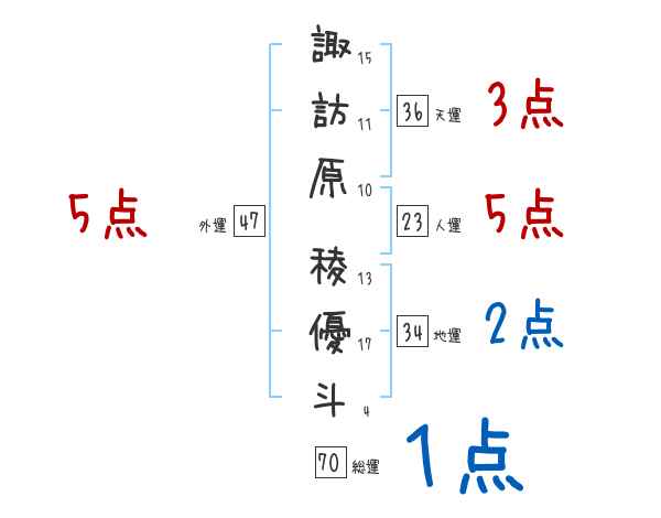 天運![]() | 諏訪原稜優斗さんの天運は36画の3つ星!先見性が豊かです。多少神経質で苦労することも。 家系が持つ宿命的な運勢を表します。祖先から受け継いだ苗字ですので自分の力が及びません。家柄を象徴します。 |