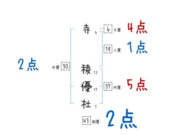 外運![]() | 寺稜優杜さんの外運は30画の2つ星!浮き沈みの激しさに注意しましょう。 生活面を象徴する運勢です。外部から受ける影響力を表し、結婚運、家庭運や職場、環境への順応性を表します。 |