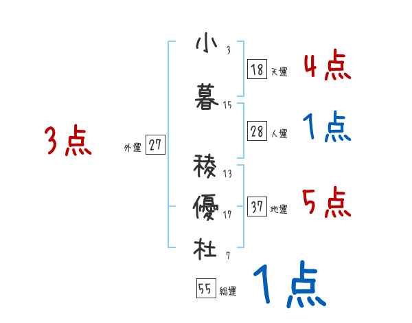 天運![]() | 小暮稜優杜さんの天運は18画の4つ星!情熱的で剛気。忍耐力があり信頼される。 家系が持つ宿命的な運勢を表します。祖先から受け継いだ苗字ですので自分の力が及びません。家柄を象徴します。 |