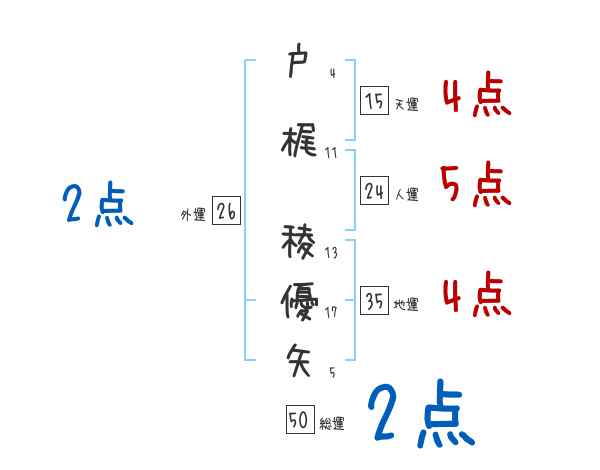 外運![]() | 戸梶稜優矢さんの外運は26画の2つ星!波瀾万丈かも。信頼できる人を大事にしましょう。 生活面を象徴する運勢です。外部から受ける影響力を表し、結婚運、家庭運や職場、環境への順応性を表します。 |