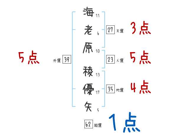 外運![]() | 海老原稜優矢さんの外運は39画の5つ星!社交性に優れ人望が厚い。人の上に立ち成功する。 生活面を象徴する運勢です。外部から受ける影響力を表し、結婚運、家庭運や職場、環境への順応性を表します。 |