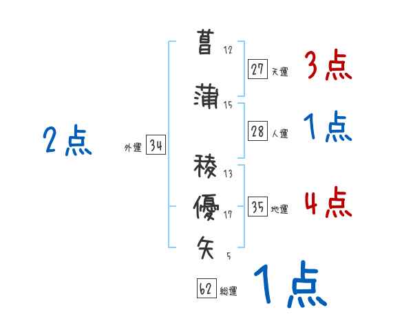 人運![]() | 菖蒲稜優矢さんの人運は28画の1つ星!家庭環境に注意。スポーツで活躍できる能力があるかも。 性格や才能などを表す2番目に重要な運勢です。人間関係や協調性、社会的な成功に影響します。主に20歳から50歳ぐらいまでの中年期の運勢を表します。 |