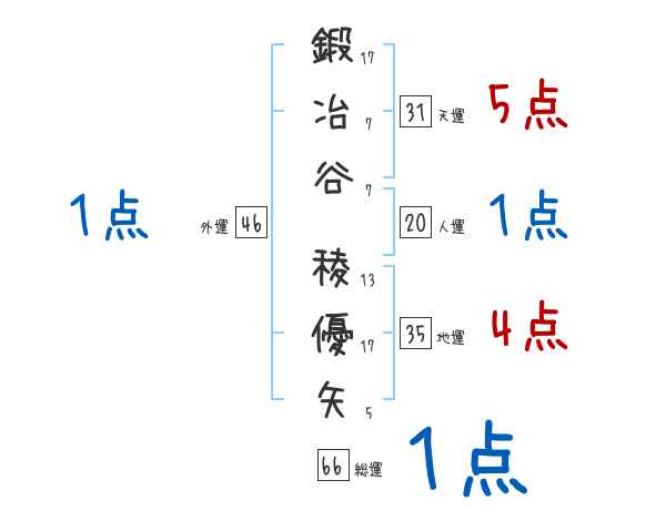 鍛冶谷稜優矢さんの画数の鑑定結果