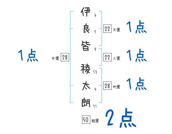 地運![]() | 伊良皆稜太朗さんの地運は28画の1つ星!家庭環境に注意。スポーツで活躍できる能力があるかも。 個性を表す基礎的な運勢です。性格形成や対人関係、行動力など家庭環境に影響されます。主に誕生してから20歳くらいまでの若年期の運勢を表します。 |