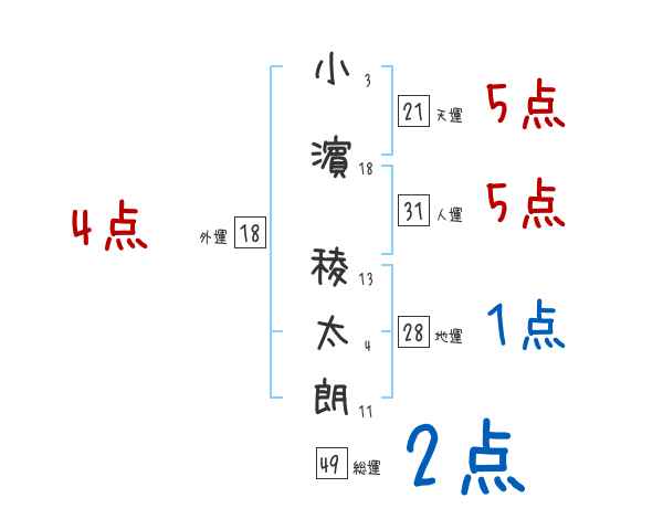 天運![]() | 小濵稜太朗さんの天運は21画の5つ星!統率力がある。独立し成功する。名誉を手に入れる。 家系が持つ宿命的な運勢を表します。祖先から受け継いだ苗字ですので自分の力が及びません。家柄を象徴します。 |