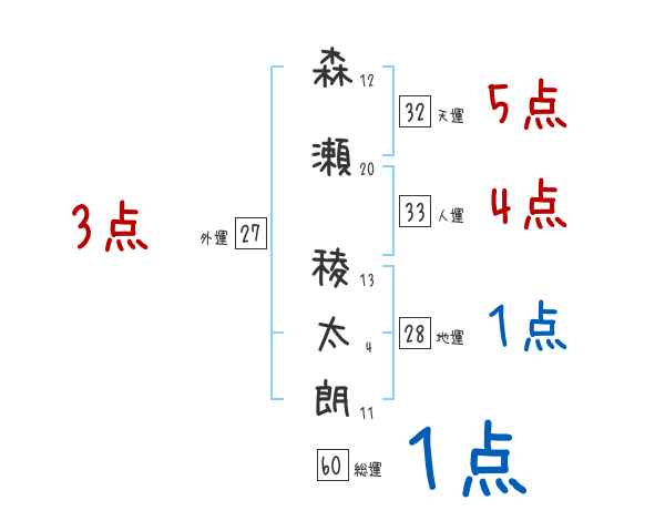 天運![]() | 森瀬稜太朗さんの天運は32画の5つ星!柔軟性があり成功する。チャンスが多く金運が良い。 家系が持つ宿命的な運勢を表します。祖先から受け継いだ苗字ですので自分の力が及びません。家柄を象徴します。 |