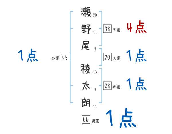 外運![]() | 瀬野尾稜太朗さんの外運は46画の1つ星!迷走することが多く苦労するかも。目先のことにとらわれないように。 生活面を象徴する運勢です。外部から受ける影響力を表し、結婚運、家庭運や職場、環境への順応性を表します。 |