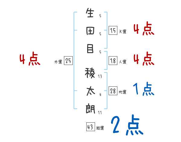 総運![]() | 生田目稜太朗さんの総運は43画の2つ星!頑固な性格で独立心が強いかも。やや非現実的で浪費に注意しましょう。 あなたの人生を表す1番重要な運勢です。生涯を通じて影響する総合運となり、主に50歳以降の晩年期に影響を及ぼします。 |
