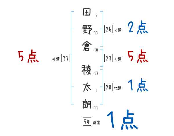 地運![]() | 田野倉稜太朗さんの地運は28画の1つ星!家庭環境に注意。スポーツで活躍できる能力があるかも。 個性を表す基礎的な運勢です。性格形成や対人関係、行動力など家庭環境に影響されます。主に誕生してから20歳くらいまでの若年期の運勢を表します。 |