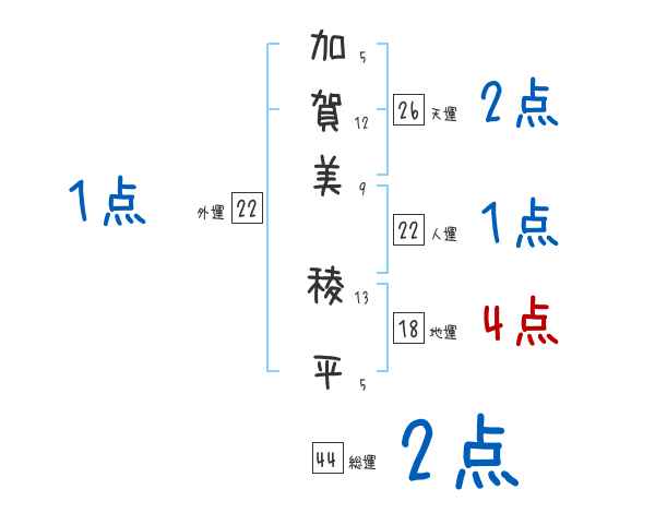 総運![]() | 加賀美稜平さんの総運は44画の2つ星!誠実で慎重な性格。物事を考えすぎないように注意しましょう。 あなたの人生を表す1番重要な運勢です。生涯を通じて影響する総合運となり、主に50歳以降の晩年期に影響を及ぼします。 |