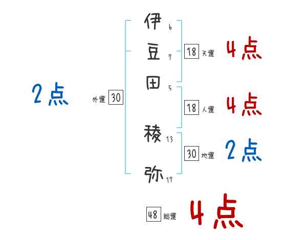 天運![]() | 伊豆田稜弥さんの天運は18画の4つ星!情熱的で剛気。忍耐力があり信頼される。 家系が持つ宿命的な運勢を表します。祖先から受け継いだ苗字ですので自分の力が及びません。家柄を象徴します。 |
