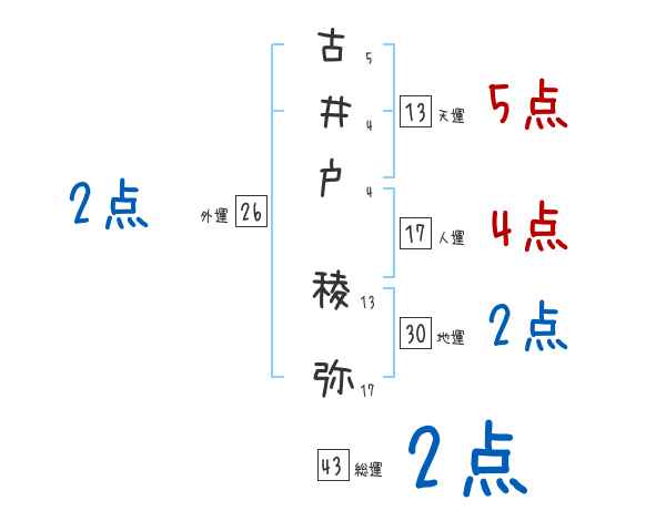外運![]() | 古井戸稜弥さんの外運は26画の2つ星!波瀾万丈かも。信頼できる人を大事にしましょう。 生活面を象徴する運勢です。外部から受ける影響力を表し、結婚運、家庭運や職場、環境への順応性を表します。 |