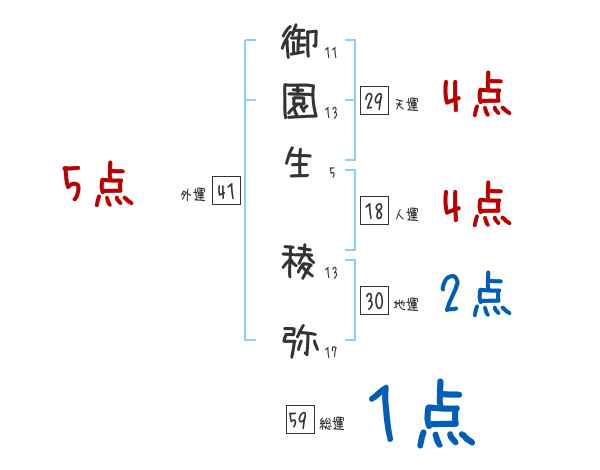 総運![]() | 御園生稜弥さんの総運は59画の1つ星!意志の弱さであきらめることが多いかも。粘り強さが必要。 あなたの人生を表す1番重要な運勢です。生涯を通じて影響する総合運となり、主に50歳以降の晩年期に影響を及ぼします。 |