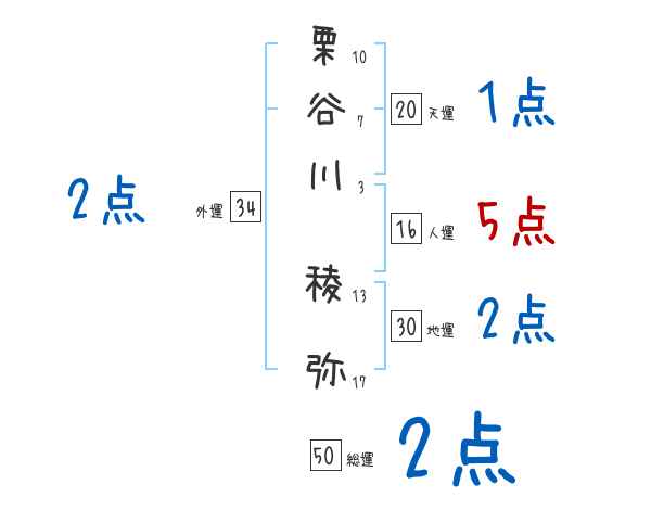 人運![]() | 栗谷川稜弥さんの人運は16画の5つ星!人望が厚く大きく発展する。逆転成功が見える。 性格や才能などを表す2番目に重要な運勢です。人間関係や協調性、社会的な成功に影響します。主に20歳から50歳ぐらいまでの中年期の運勢を表します。 |