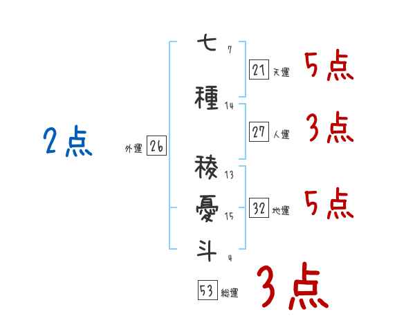 地運![]() | 七種稜憂斗さんの地運は32画の5つ星!柔軟性があり成功する。チャンスが多く金運が良い。 個性を表す基礎的な運勢です。性格形成や対人関係、行動力など家庭環境に影響されます。主に誕生してから20歳くらいまでの若年期の運勢を表します。 |