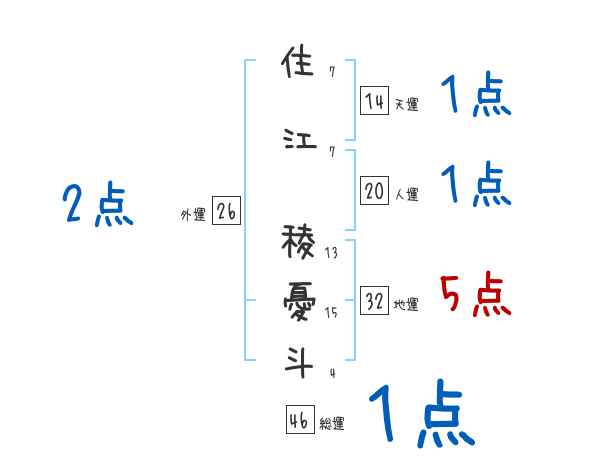 外運![]() | 住江稜憂斗さんの外運は26画の2つ星!波瀾万丈かも。信頼できる人を大事にしましょう。 生活面を象徴する運勢です。外部から受ける影響力を表し、結婚運、家庭運や職場、環境への順応性を表します。 |