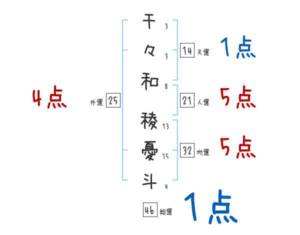 総運![]() | 千々和稜憂斗さんの総運は46画の1つ星!迷走することが多く苦労するかも。目先のことにとらわれないように。 あなたの人生を表す1番重要な運勢です。生涯を通じて影響する総合運となり、主に50歳以降の晩年期に影響を及ぼします。 |