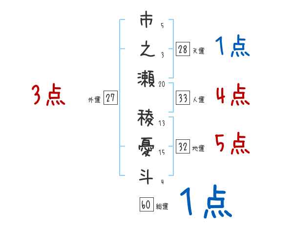 天運![]() | 市之瀬稜憂斗さんの天運は28画の1つ星!家庭環境に注意。スポーツで活躍できる能力があるかも。 家系が持つ宿命的な運勢を表します。祖先から受け継いだ苗字ですので自分の力が及びません。家柄を象徴します。 |