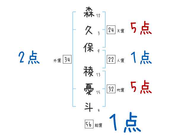 総運![]() | 森久保稜憂斗さんの総運は56画の1つ星!消極的で無気力になりがち。誠実な気持ちが必要でしょう。 あなたの人生を表す1番重要な運勢です。生涯を通じて影響する総合運となり、主に50歳以降の晩年期に影響を及ぼします。 |