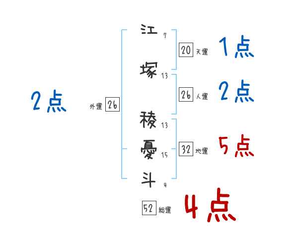 外運![]() | 江塚稜憂斗さんの外運は26画の2つ星!波瀾万丈かも。信頼できる人を大事にしましょう。 生活面を象徴する運勢です。外部から受ける影響力を表し、結婚運、家庭運や職場、環境への順応性を表します。 |