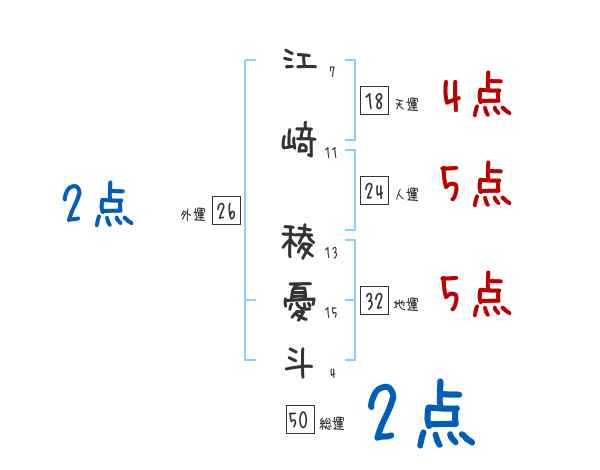 外運![]() | 江﨑稜憂斗さんの外運は26画の2つ星!波瀾万丈かも。信頼できる人を大事にしましょう。 生活面を象徴する運勢です。外部から受ける影響力を表し、結婚運、家庭運や職場、環境への順応性を表します。 |
