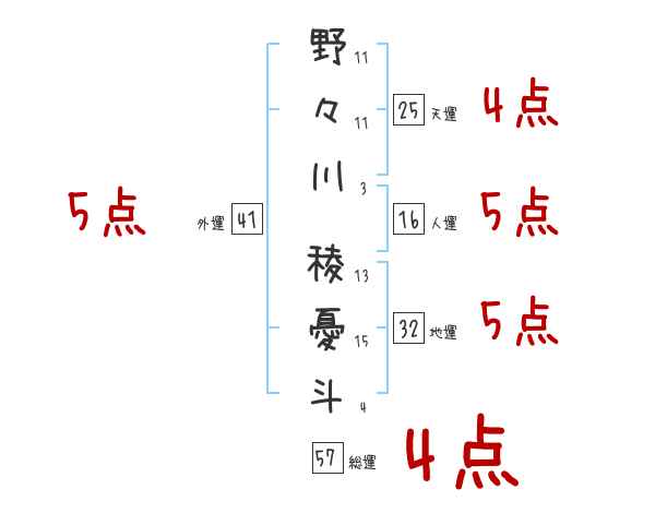 総運![]() | 野々川稜憂斗さんの総運は57画の4つ星!向上心があり人望がある。地位を得る。 あなたの人生を表す1番重要な運勢です。生涯を通じて影響する総合運となり、主に50歳以降の晩年期に影響を及ぼします。 |
