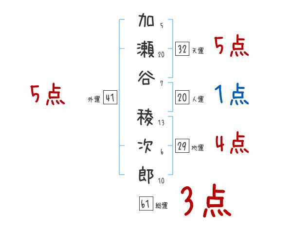 天運![]() | 加瀬谷稜次郎さんの天運は32画の5つ星!柔軟性があり成功する。チャンスが多く金運が良い。 家系が持つ宿命的な運勢を表します。祖先から受け継いだ苗字ですので自分の力が及びません。家柄を象徴します。 |
