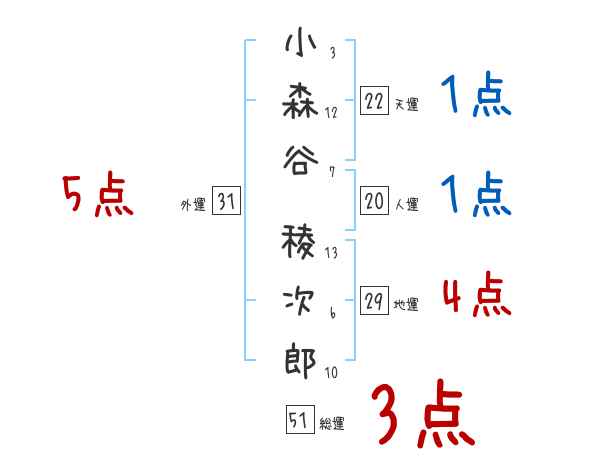 天運![]() | 小森谷稜次郎さんの天運は22画の1つ星!努力することが苦手ないっぽう手先が器用。芸術性にも優れる。 家系が持つ宿命的な運勢を表します。祖先から受け継いだ苗字ですので自分の力が及びません。家柄を象徴します。 |