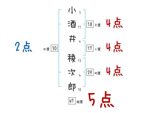 総運![]() | 小酒井稜次郎さんの総運は47画の5つ星!実力が開花し発展する円満な人生。財に恵まれる。 あなたの人生を表す1番重要な運勢です。生涯を通じて影響する総合運となり、主に50歳以降の晩年期に影響を及ぼします。 |