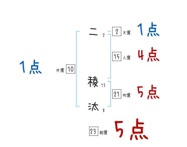 総運![]() | 二稜汰さんの総運は23画の5つ星!想像力に優れ活力がある。一代で成功し名誉を手に入れる。 あなたの人生を表す1番重要な運勢です。生涯を通じて影響する総合運となり、主に50歳以降の晩年期に影響を及ぼします。 |