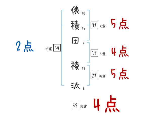 外運![]() | 俵積田稜汰さんの外運は34画の2つ星!独創性に優れるが、自尊心が強く災難に注意しましょう。 生活面を象徴する運勢です。外部から受ける影響力を表し、結婚運、家庭運や職場、環境への順応性を表します。 |