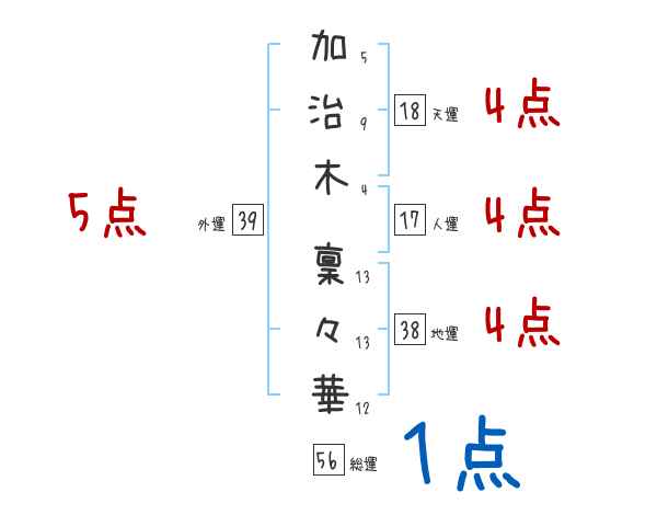外運![]() | 加治木稟々華さんの外運は39画の5つ星!社交性に優れ人望が厚い。人の上に立ち成功する。 生活面を象徴する運勢です。外部から受ける影響力を表し、結婚運、家庭運や職場、環境への順応性を表します。 |
