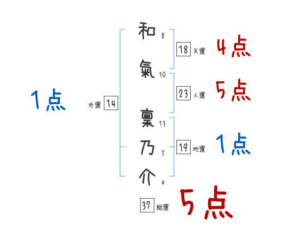人運![]() | 和氣稟乃介さんの人運は23画の5つ星!想像力に優れ活力がある。一代で成功し名誉を手に入れる。 性格や才能などを表す2番目に重要な運勢です。人間関係や協調性、社会的な成功に影響します。主に20歳から50歳ぐらいまでの中年期の運勢を表します。 |