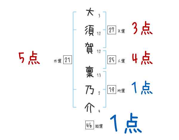 | 外運  | 大須賀稟乃介さんの外運は21画の5つ星!統率力がある。独立し成功する。名誉を手に入れる。生活面を象徴する運勢です。外部から受ける影響力を表し、結婚運、家庭運や職場、環境への順応性を表します。 |