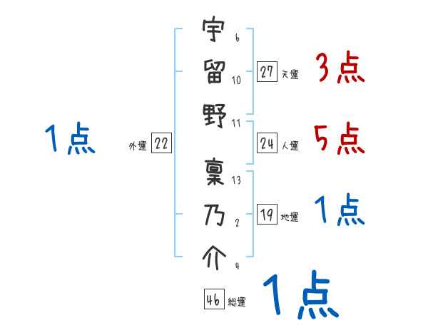 総運![]() | 宇留野稟乃介さんの総運は46画の1つ星!迷走することが多く苦労するかも。目先のことにとらわれないように。 あなたの人生を表す1番重要な運勢です。生涯を通じて影響する総合運となり、主に50歳以降の晩年期に影響を及ぼします。 |