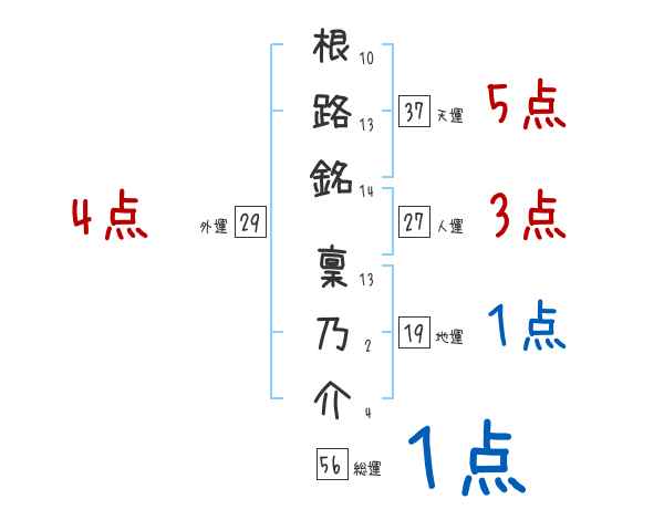 地運![]() | 根路銘稟乃介さんの地運は19画の1つ星!優れた才能を持ちますが、協調性が足りないことも。周りの人と協力する事を意識しましょう。 個性を表す基礎的な運勢です。性格形成や対人関係、行動力など家庭環境に影響されます。主に誕生してから20歳くらいまでの若年期の運勢を表します。 |