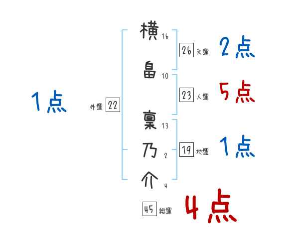 総運![]() | 横畠稟乃介さんの総運は45画の4つ星!もくもくと物事を進め達成する。地味な努力家。 あなたの人生を表す1番重要な運勢です。生涯を通じて影響する総合運となり、主に50歳以降の晩年期に影響を及ぼします。 |