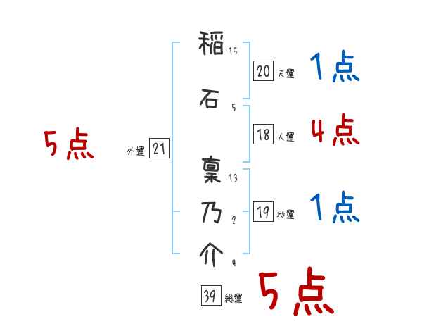 総運![]() | 稲石稟乃介さんの総運は39画の5つ星!社交性に優れ人望が厚い。人の上に立ち成功する。 あなたの人生を表す1番重要な運勢です。生涯を通じて影響する総合運となり、主に50歳以降の晩年期に影響を及ぼします。 |