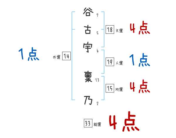 天運![]() | 谷古宇稟乃さんの天運は18画の4つ星!情熱的で剛気。忍耐力があり信頼される。 家系が持つ宿命的な運勢を表します。祖先から受け継いだ苗字ですので自分の力が及びません。家柄を象徴します。 |