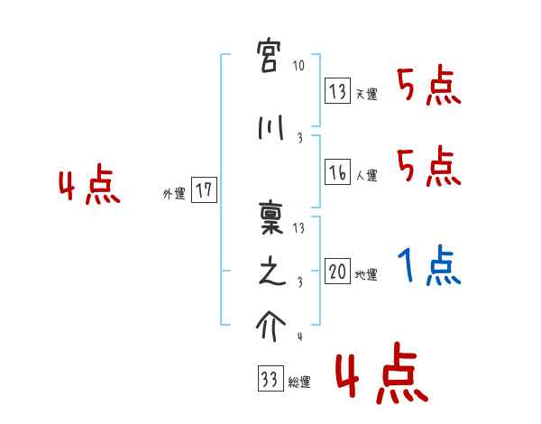 外運![]() | 宮川稟之介さんの外運は17画の4つ星!積極的な行動力。地位を気づき財産を手に入れる。純粋な心と直感力。 生活面を象徴する運勢です。外部から受ける影響力を表し、結婚運、家庭運や職場、環境への順応性を表します。 |