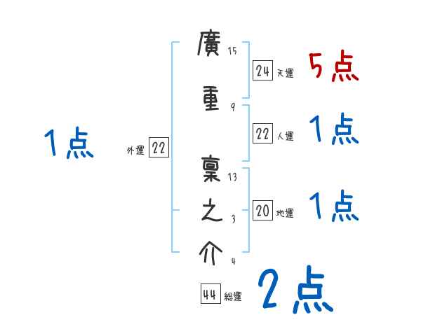 総運![]() | 廣重稟之介さんの総運は44画の2つ星!誠実で慎重な性格。物事を考えすぎないように注意しましょう。 あなたの人生を表す1番重要な運勢です。生涯を通じて影響する総合運となり、主に50歳以降の晩年期に影響を及ぼします。 |