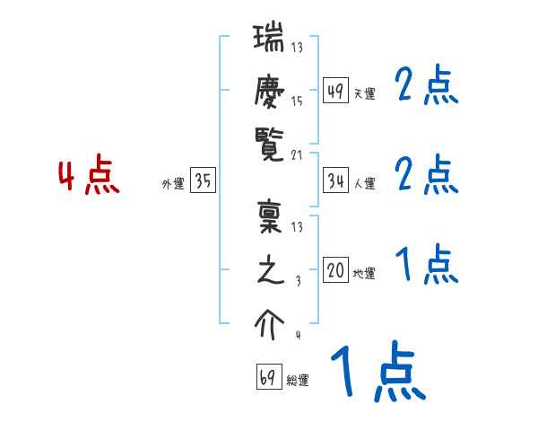 天運![]() | 瑞慶覧稟之介さんの天運は49画の2つ星!不安定な性格で明暗がある人生。周りの人には支援されやすい。 家系が持つ宿命的な運勢を表します。祖先から受け継いだ苗字ですので自分の力が及びません。家柄を象徴します。 |