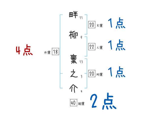 外運![]() | 畔柳稟之介さんの外運は18画の4つ星!情熱的で剛気。忍耐力があり信頼される。 生活面を象徴する運勢です。外部から受ける影響力を表し、結婚運、家庭運や職場、環境への順応性を表します。 |