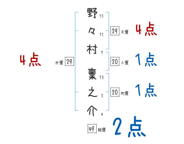 天運![]() | 野々村稟之介さんの天運は29画の4つ星!完全主義で才能がある。厳格な心の持ち主。 家系が持つ宿命的な運勢を表します。祖先から受け継いだ苗字ですので自分の力が及びません。家柄を象徴します。 |