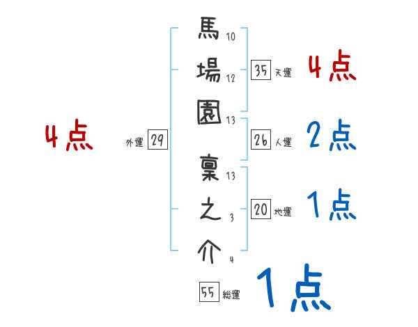 天運![]() | 馬場園稟之介さんの天運は35画の4つ星!温厚な性格で感受性が高い。穏和な性格で人望が厚い。 家系が持つ宿命的な運勢を表します。祖先から受け継いだ苗字ですので自分の力が及びません。家柄を象徴します。 |