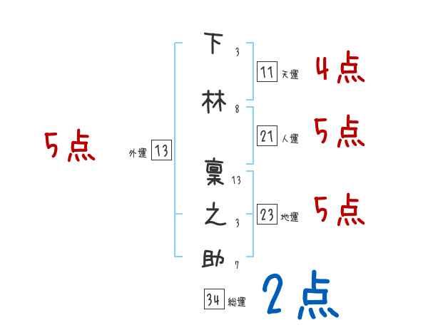 総運![]() | 下林稟之助さんの総運は34画の2つ星!独創性に優れるが、自尊心が強く災難に注意しましょう。 あなたの人生を表す1番重要な運勢です。生涯を通じて影響する総合運となり、主に50歳以降の晩年期に影響を及ぼします。 |